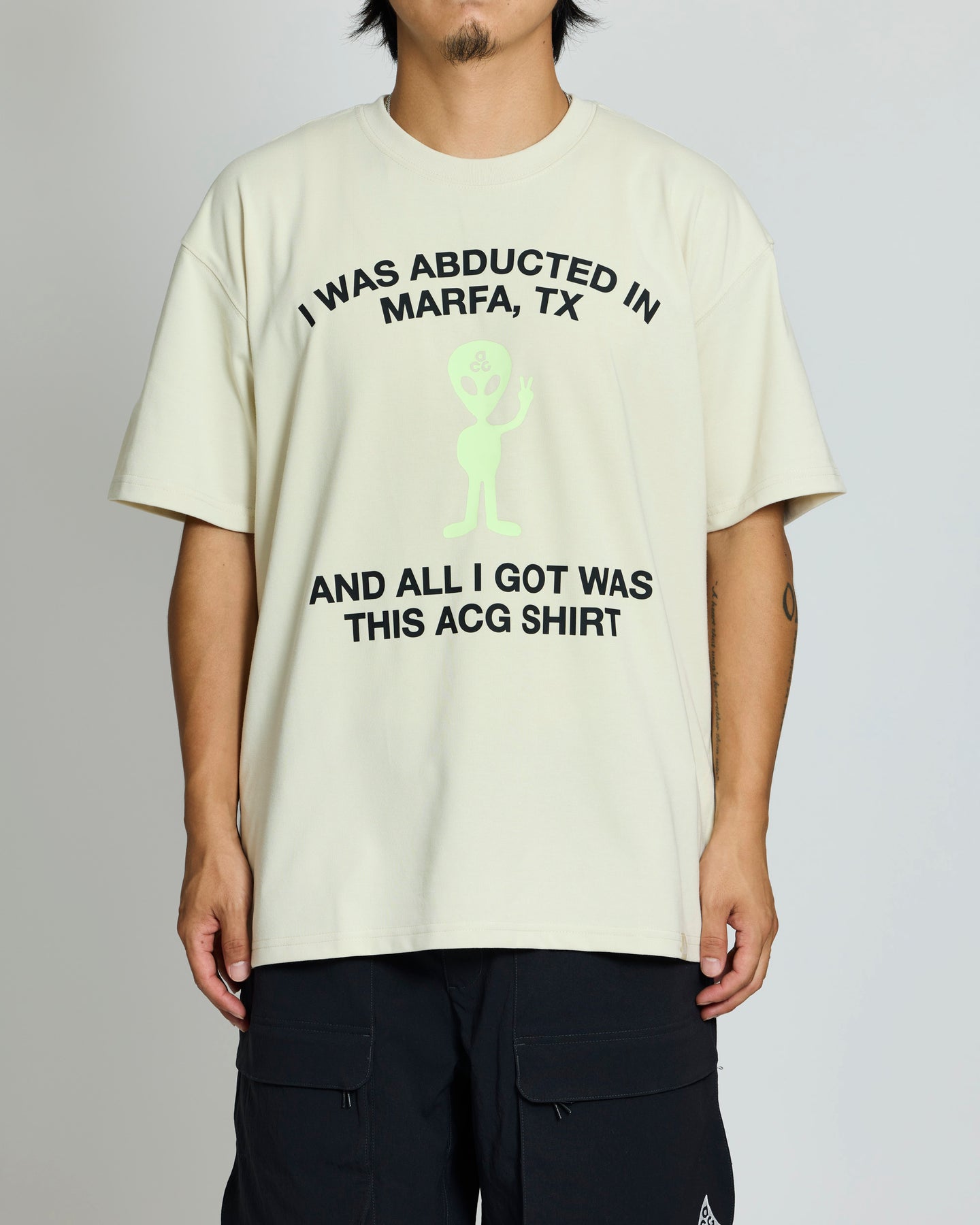 宇宙と自然との境界を感じさせるデザインを落とし込んだ S/S TEE。軽やかなジャージ素材を採用し、体にまとわりつかない快適な着心地。胸部にはアレンモチーフのグラフィックがあしらわれ、ACGらしい冒険的な世界観を演出。ルーズシルエットでレイヤードもしやすく、街中でもアウトドアでも映える一枚です。