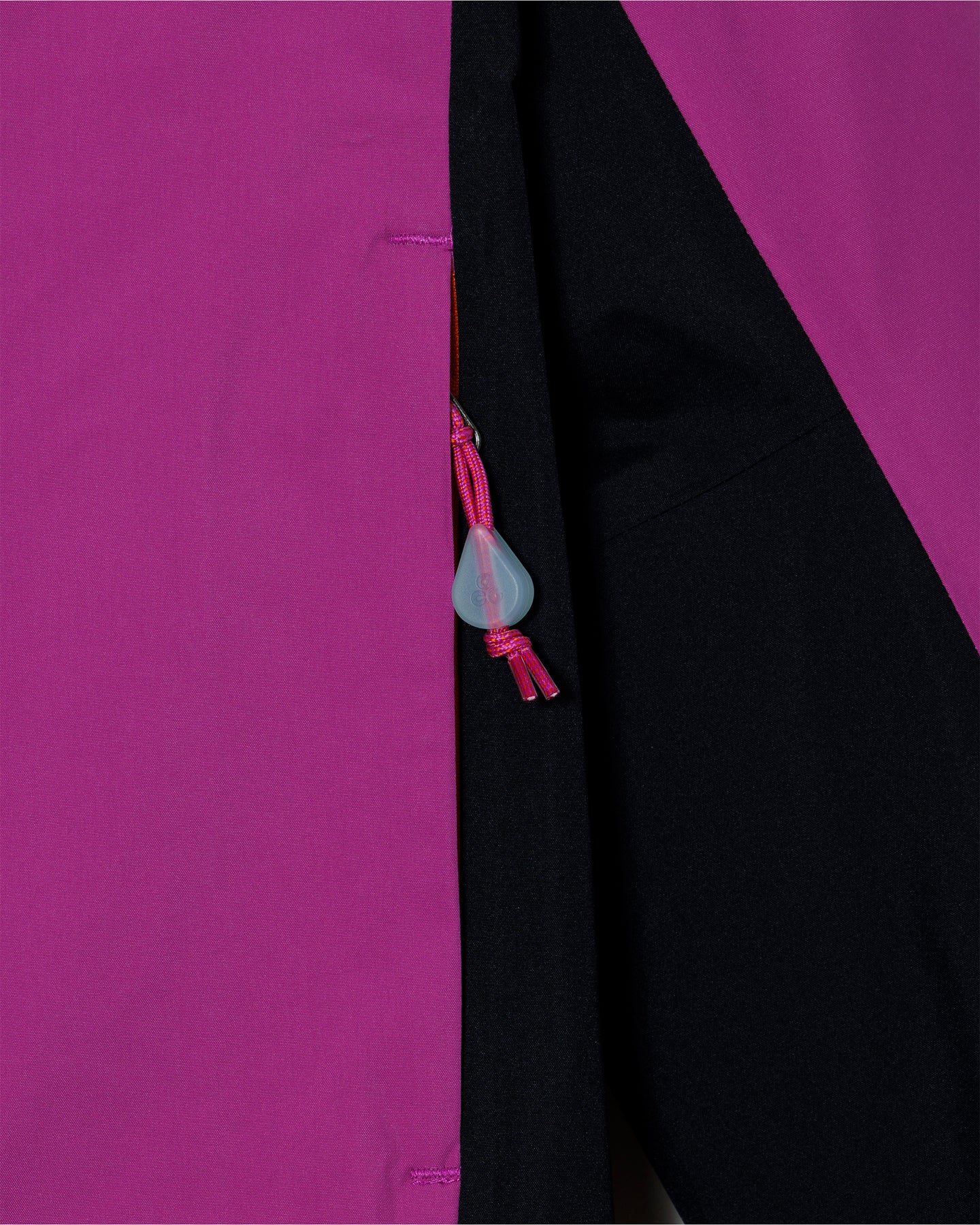 しなやかなナイロン素材を用いたアッパーは、過度なハリを抑えた落ち着いた表情。ダブルジップやフード背面・裾に配されたバンジーコードにより、シルエットとカバー範囲を細かく調整できます。必要な小物を収められるジッパーポケットも備え、実用性にも配慮されています。
