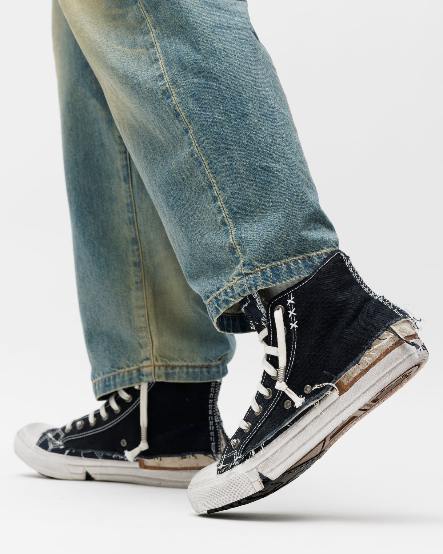 アッパーとライニングにはコットンキャンバスを使用し、素朴なテクスチャの中に内装のヤギ革がラグジュアリーなコントラストを添えます。タンには象徴的なナンバリングラベルを配置し、ブランドのヘリテージを静かに主張。クラシックなハイトップのフォルムを軸にしながら、未完成性と時間性を“完成形の美”へと昇華させた一足です。