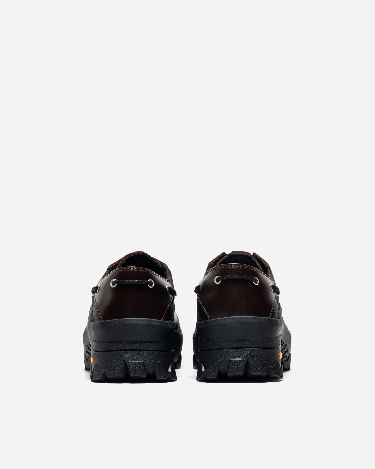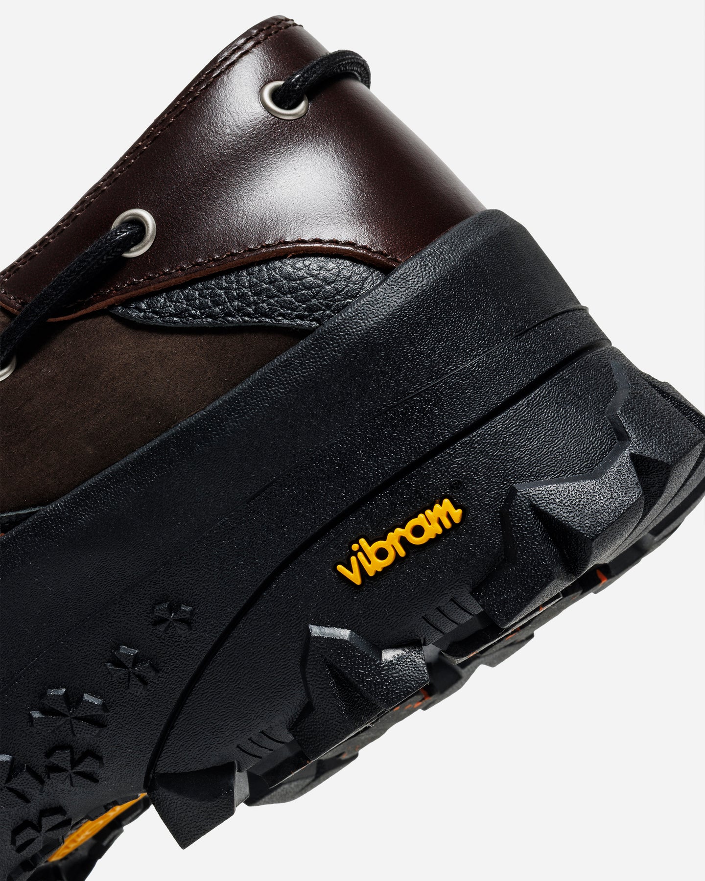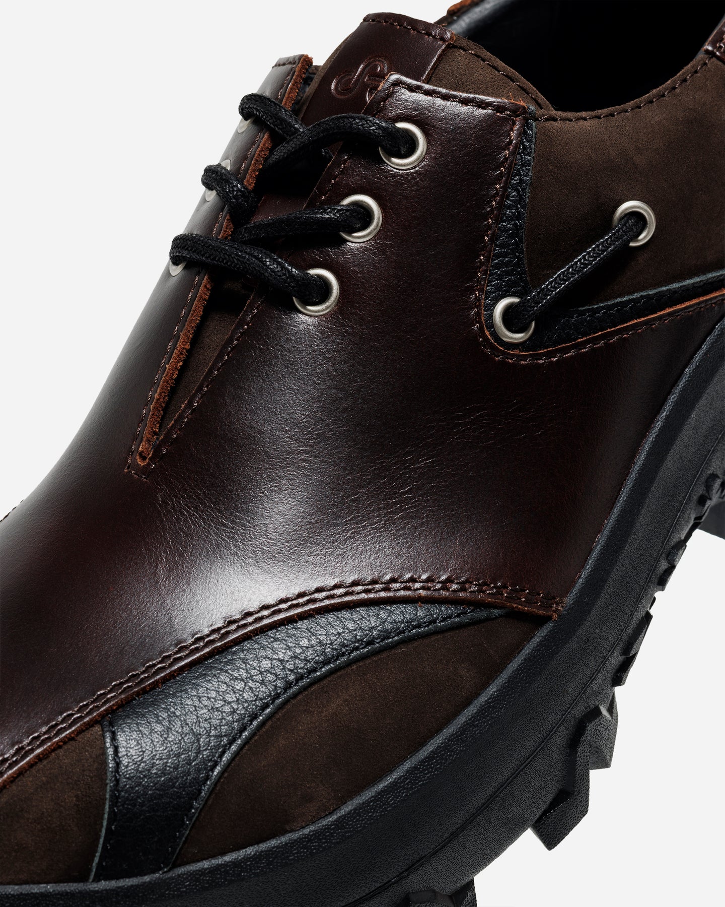 重ねられたアッパーは、オイルレザー、シボ、ヌバックを組み合わせた多層構造。角度によってねじれ、弧を描くラインが足全体を包み込む。素材ごとの表情差が、視覚的な奥行きと触れたときの密度感を生み、単なる装飾ではない構造美として立ち上がる。
