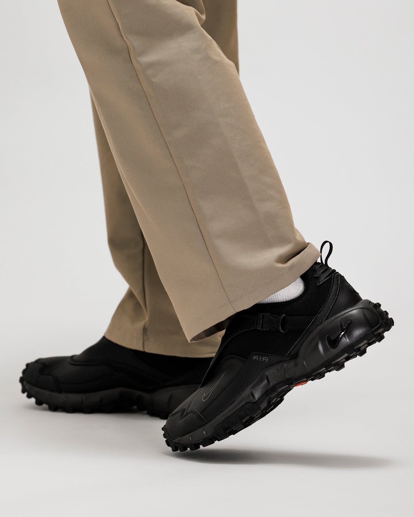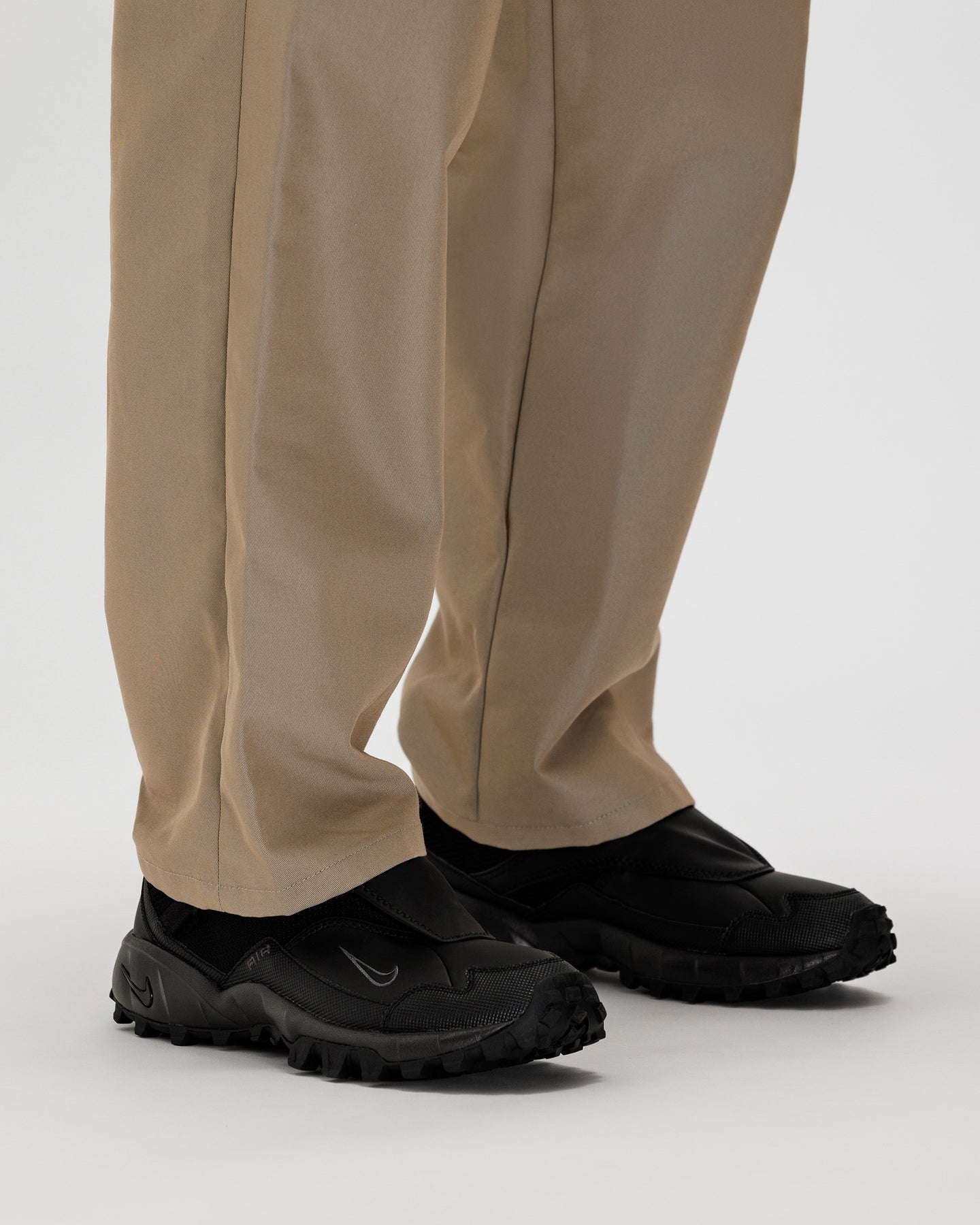 ローカットに近いシルエットながら、足の甲を覆うシュラウド構造と、テントの雨除けフラップを思わせるベルクロ留めのカバーを採用。側面には独自のバックル付きストラップが備えられ、カバーをしっかりと固定しながらフィット感を自在に調節可能。アウトソールには厚みのある頑丈なラバーを用い、マウンテンバイクのタイヤのような深いラグパターンを刻むことで、泥や砂利道といったタフな地形でも圧倒的なグリップ力を発揮。