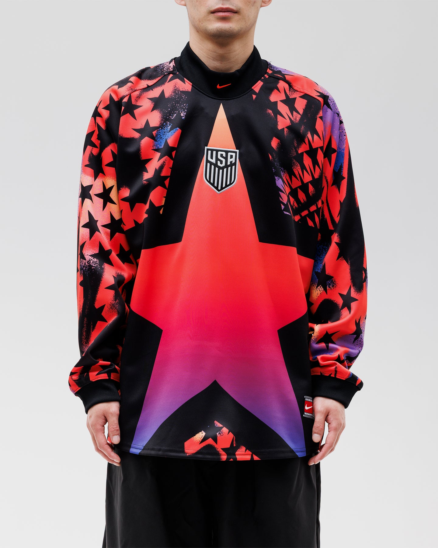 ゴールを守る“最後の砦”のスピリットを、街で着こなせるロングスリーブトップへと昇華。アメリカ代表(USA)を象徴するグラフィックを大胆に配し、ルーズフィットで洗練されたモダンな雰囲気に仕上げています。軽やかなポリエステル素材の落ち感がスタイルの幅を広げ、日常にも溶け込む自然な存在感。GKカルチャーをファッションとして楽しめる、一着持っておきたいアイテムです。