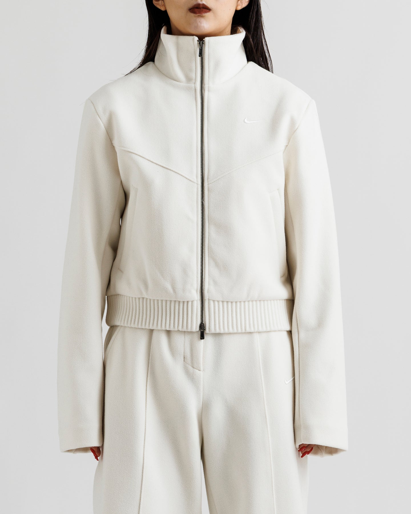テーラードの構築美とスポーツの機能性を融合させたジャケット。デコンストラクトデザインのディテールがクラシックな印象にモダンな抜け感を加え、スポーティな表情を引き立てます。厚手のフレンチテリー素材がしっかりとした着心地を生み、サテンの裏地が快適さをプラス。Nikeの歴史にオマージュを捧げる26度のV字型ラインが象徴的なアクセントに。ウエストのドローストリングでシルエットを自在に調整でき、隠しジッパーポケットで小物もスマートに収納可能です。同素材のトラウザーパンツと組み合わせれば、上品で抜け感のあるセットアップスタイルが完成。