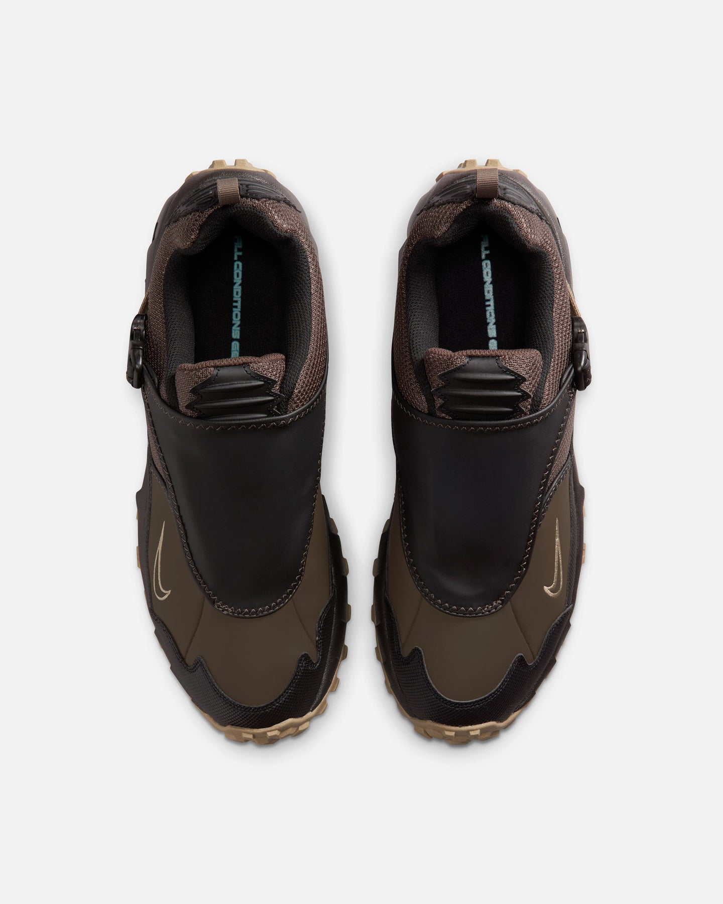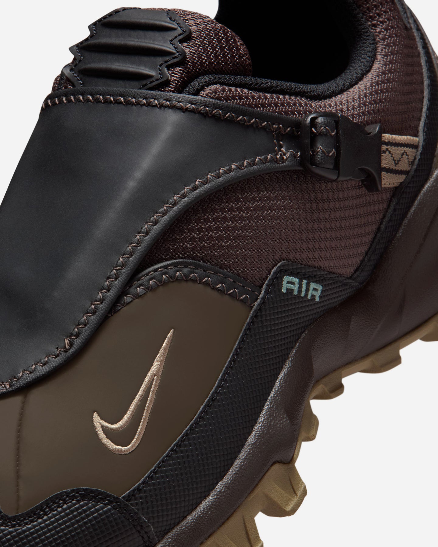 ローカットに近いシルエットながら、足の甲を覆うシュラウド構造と、テントの雨除けフラップを思わせるベルクロ留めのカバーを採用。側面には独自のバックル付きストラップが備えられ、カバーをしっかりと固定しながらフィット感を自在に調節可能。アウトソールには厚みのある頑丈なラバーを用い、マウンテンバイクのタイヤのような深いラグパターンを刻むことで、泥や砂利道といったタフな地形でも圧倒的なグリップ力を発揮。