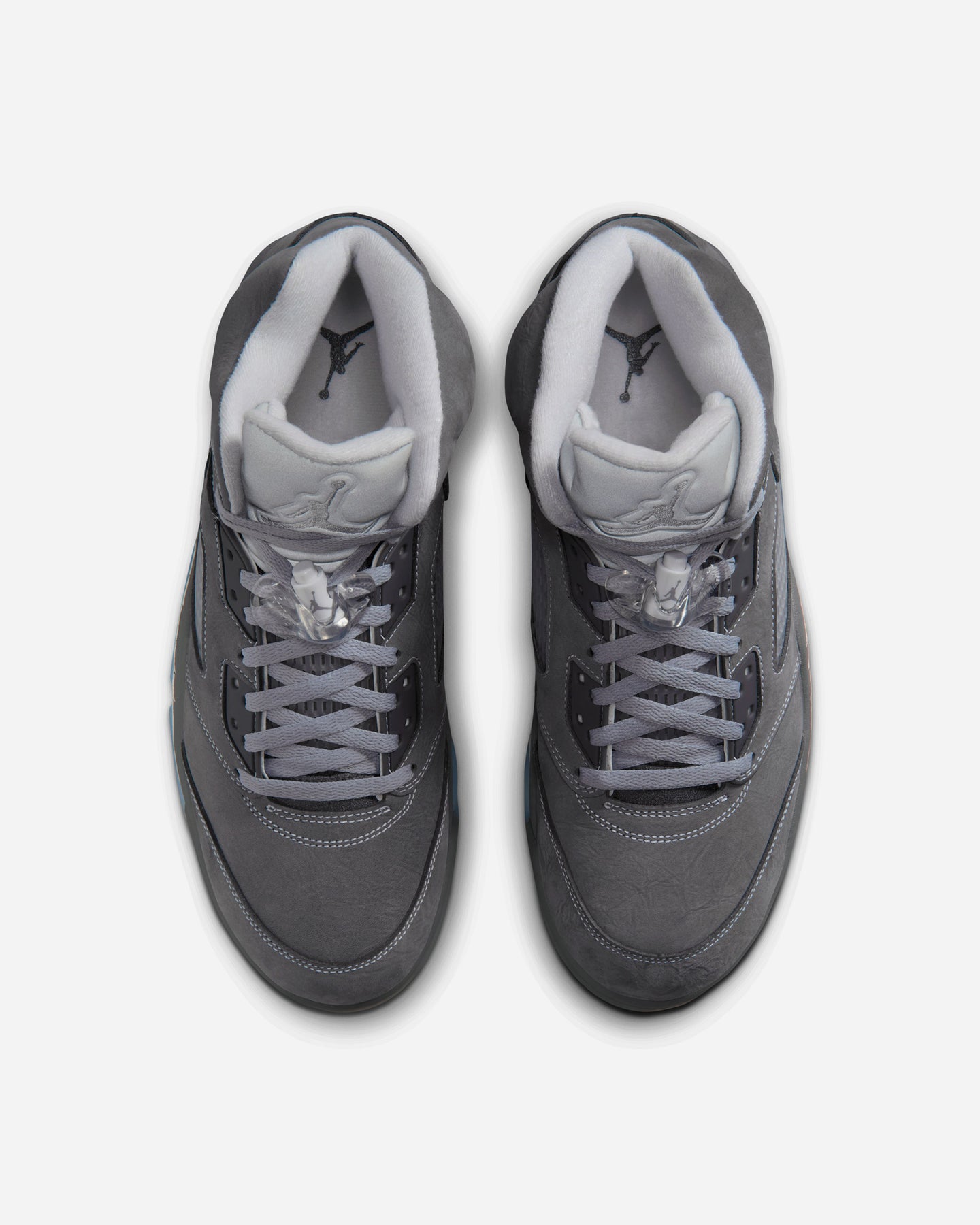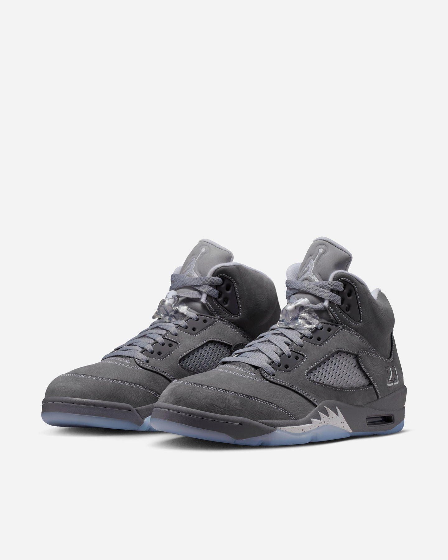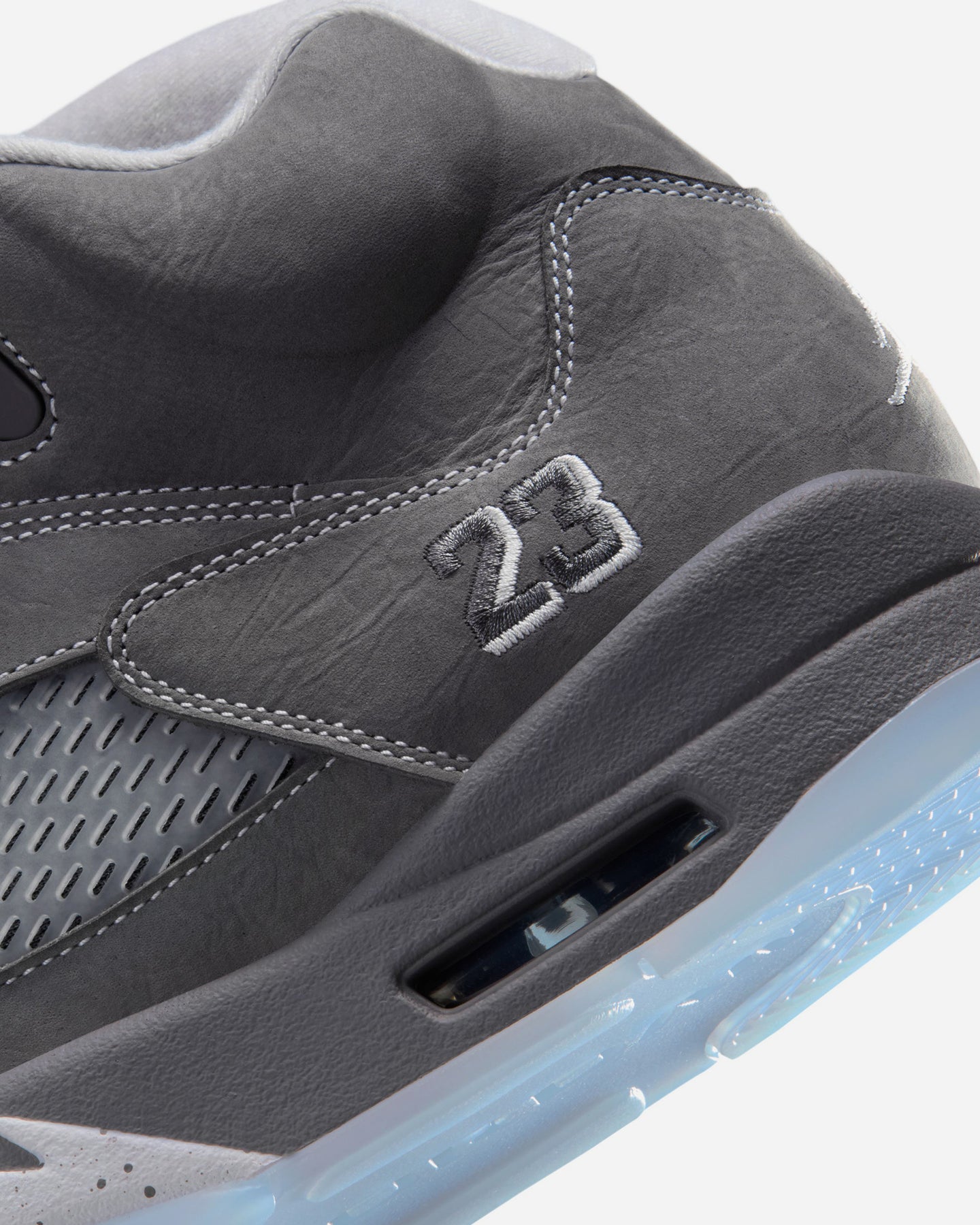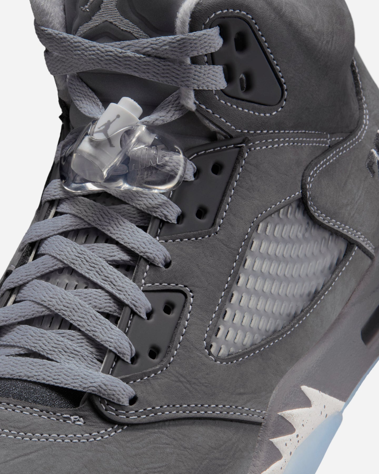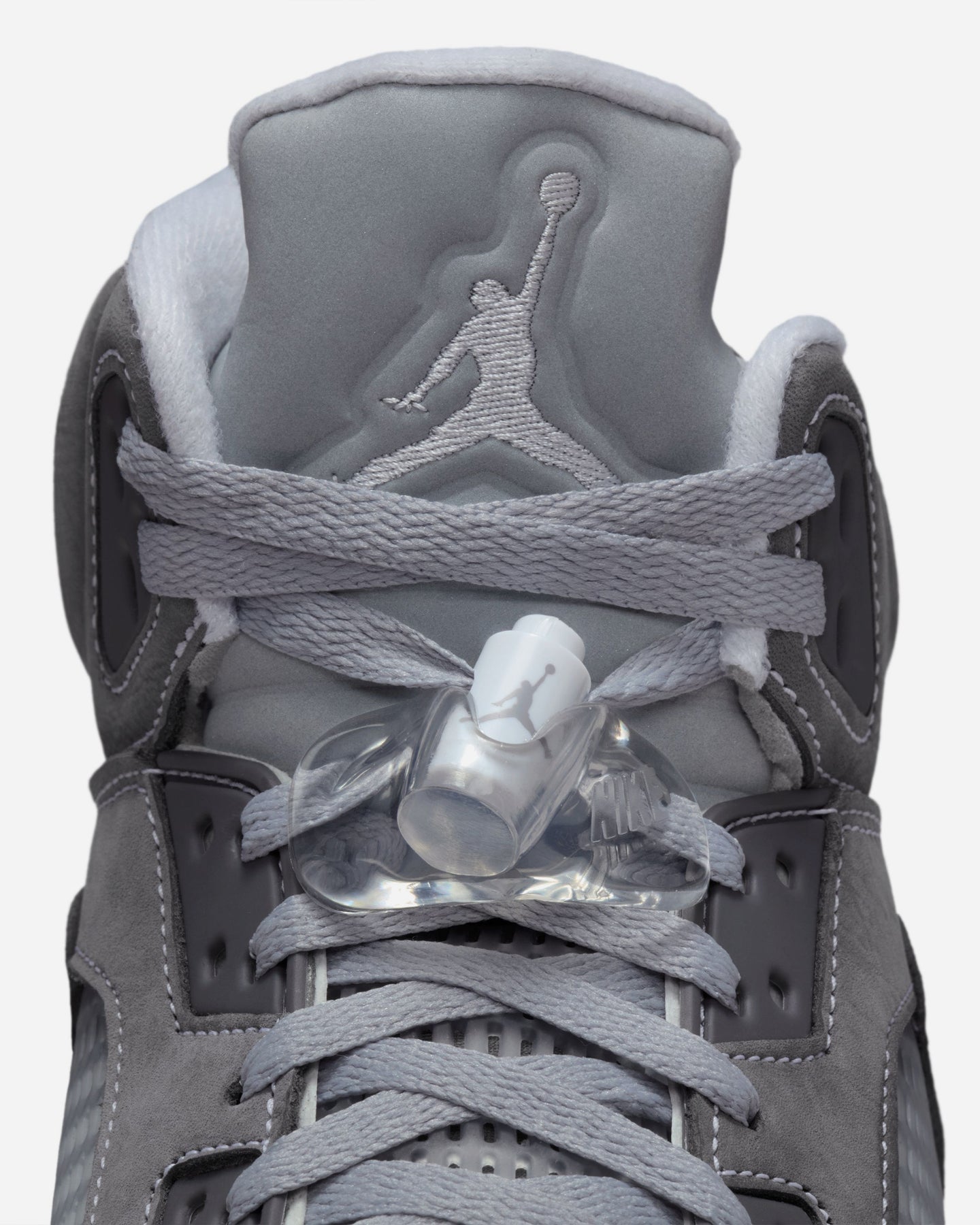 アッパーはライトグラファイトを基調に、ホワイトとウルフグレーで構成。戦闘機のノーズアートに着想を得たミッドソールのラインや、立体的な履き口まわりが、彫刻のような陰影を生む。クリアパーツやシューレーストグルといった象徴的ディテールも、過不足なく配置されている。