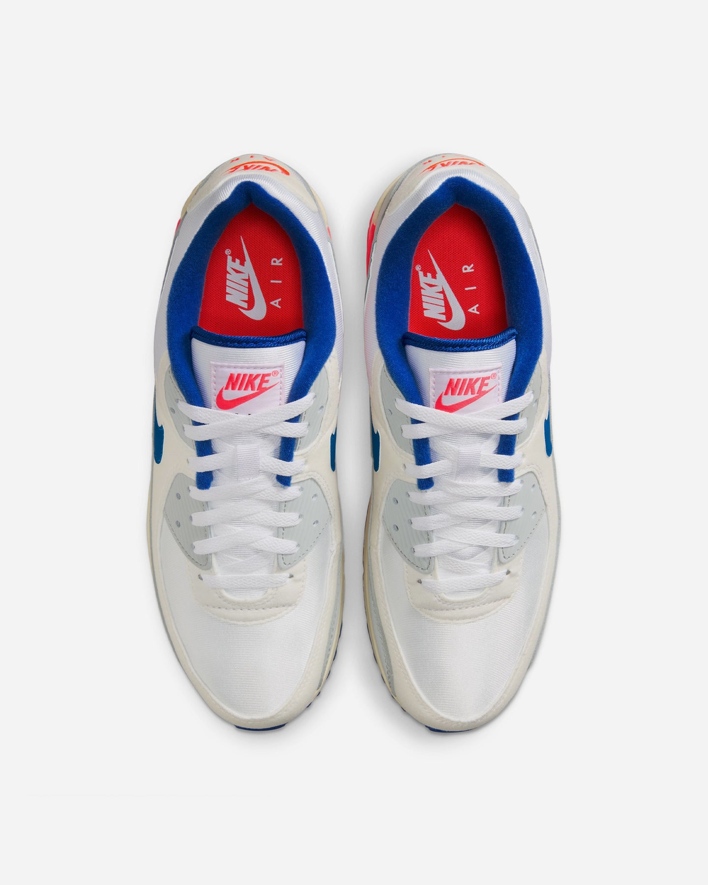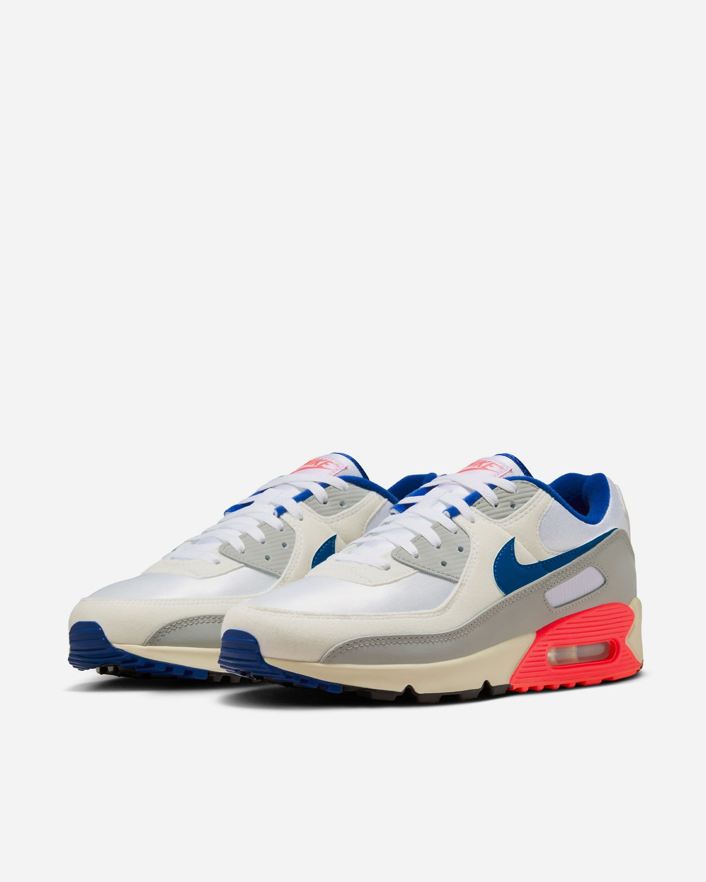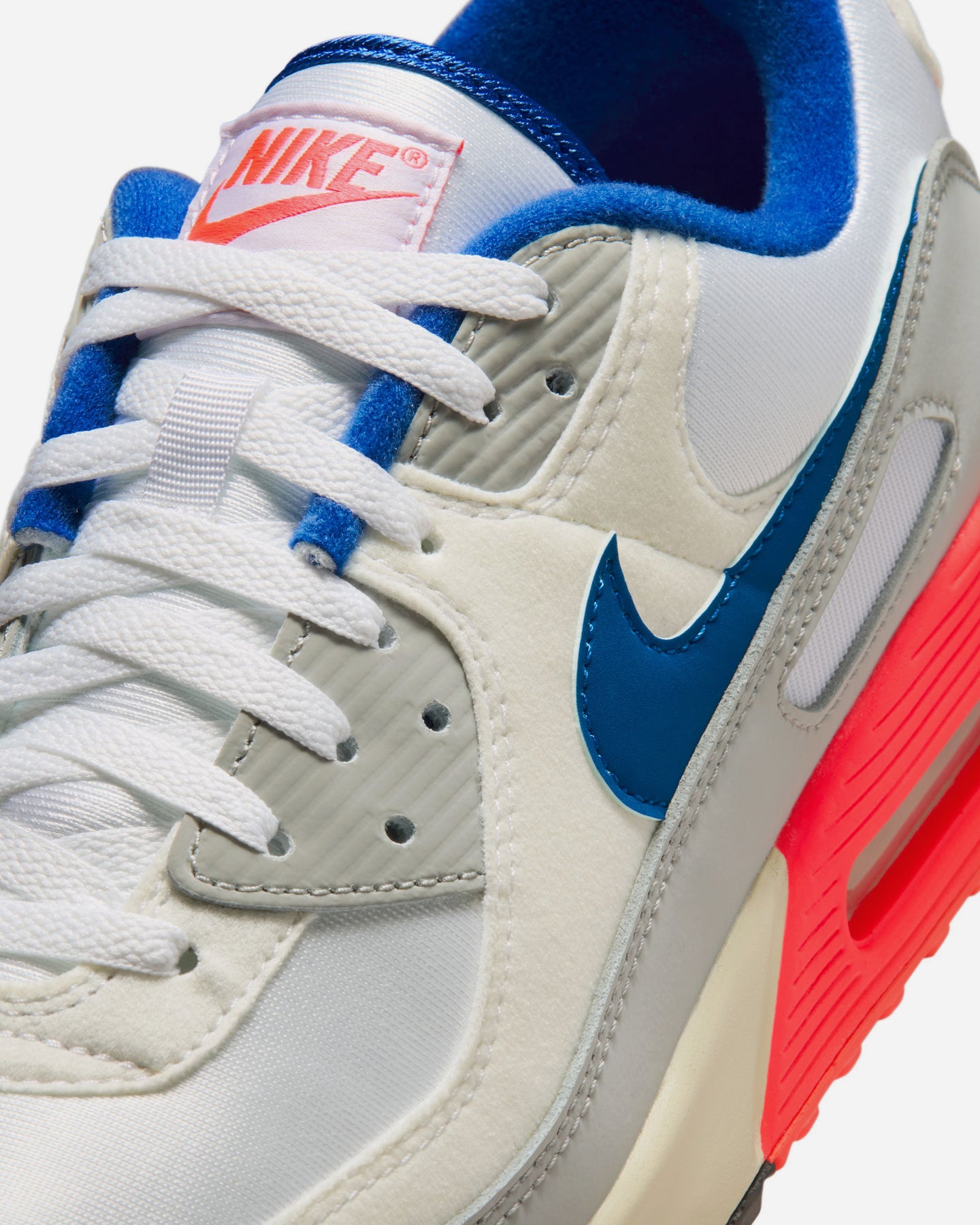 アッパーにはレザーとシンセティックオーバーレイを重ね、奥行きのあるレイヤードデザインを構築。ライトベースグレーを軸に、スポーツロイヤルやサイレンレッドのアクセントを差し込むことで、90年代らしいコントラストを描いています。ステッチやテクスチャーの変化が、足元に立体感をもたらします。