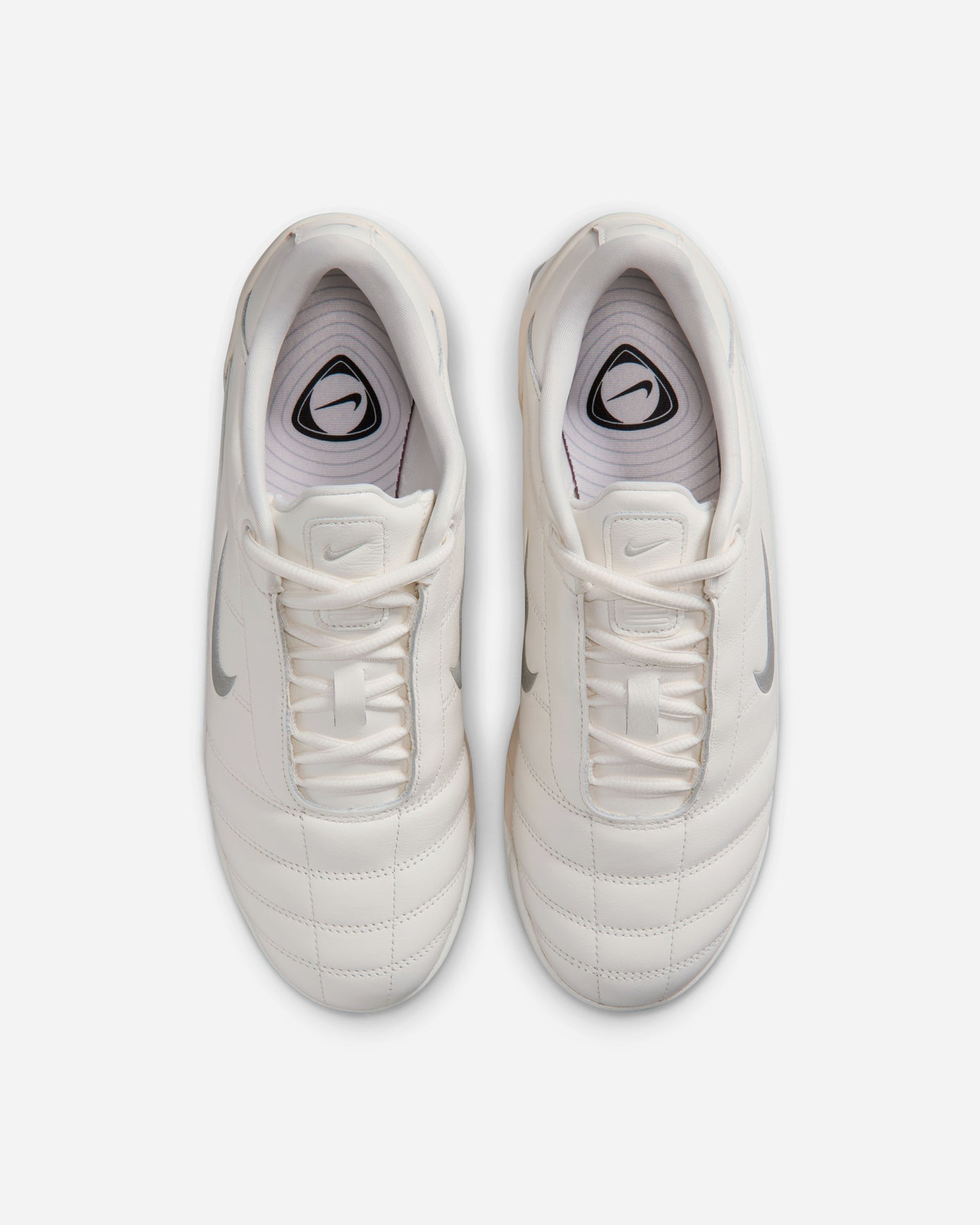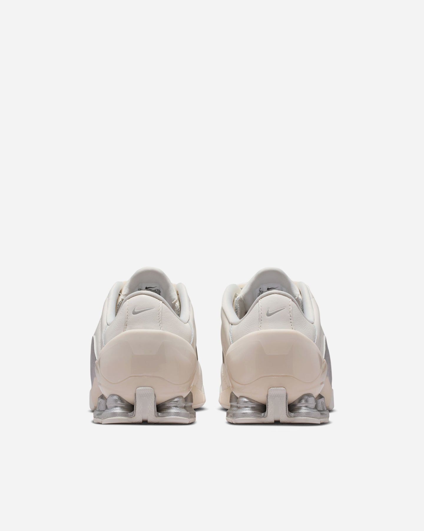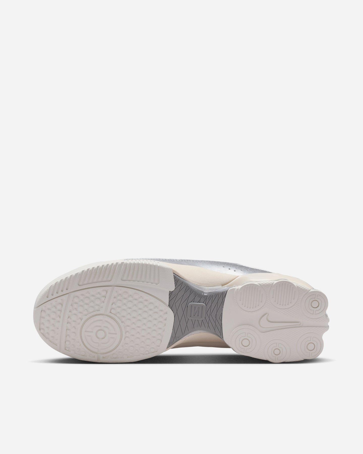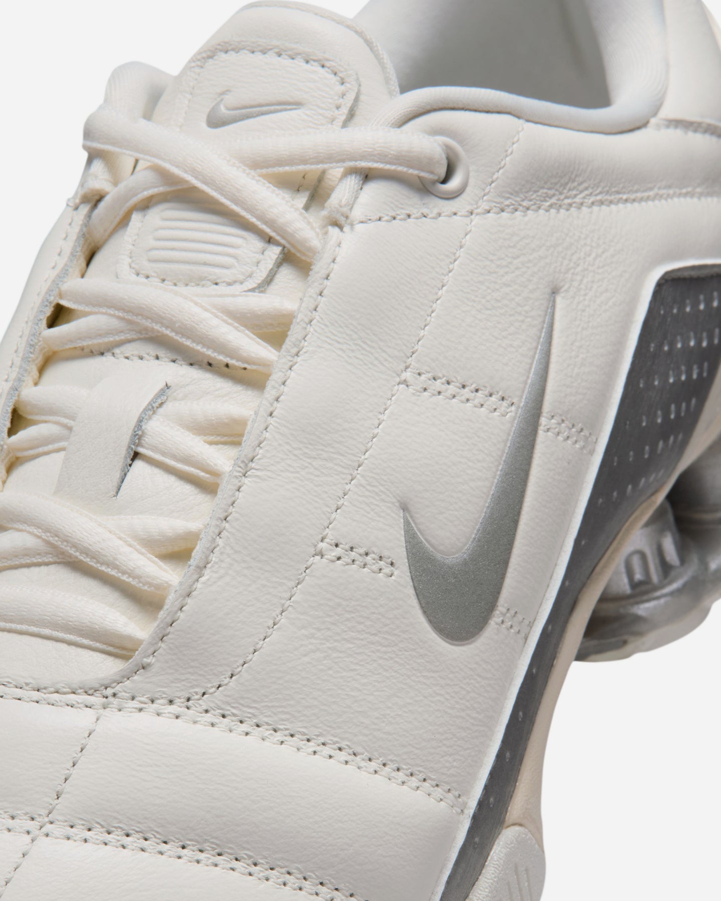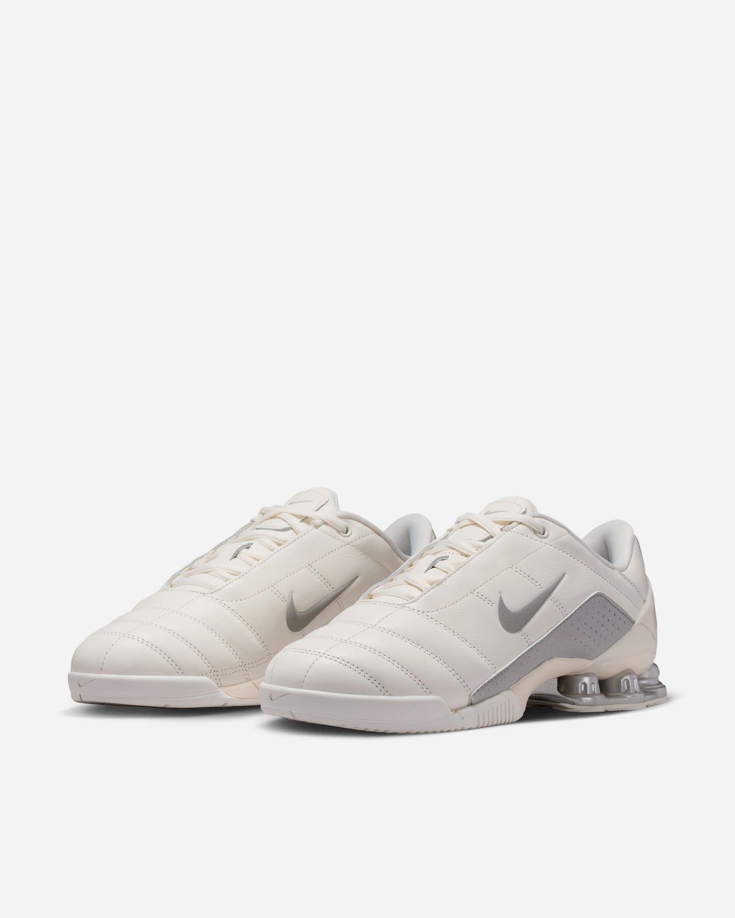 アッパーには上質な天然皮革を使用し、セイルカラーならではの柔らかく静かな表情を演出。メタリックシルバーのShoxユニットやマッドガード、Swooshロゴが、クラシックな素材感にシャープなコントラストを与えています。装飾を抑えた構成の中に、フューチャリスティックなディテールが際立ちます。