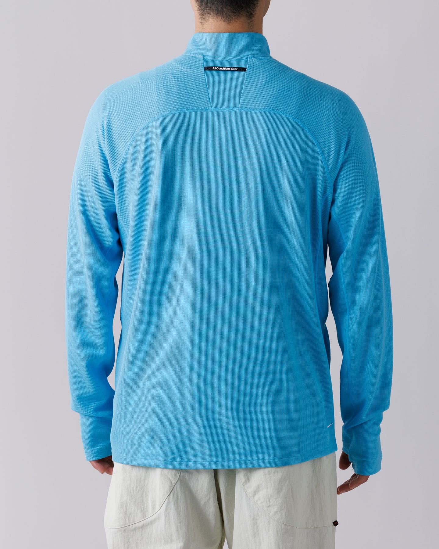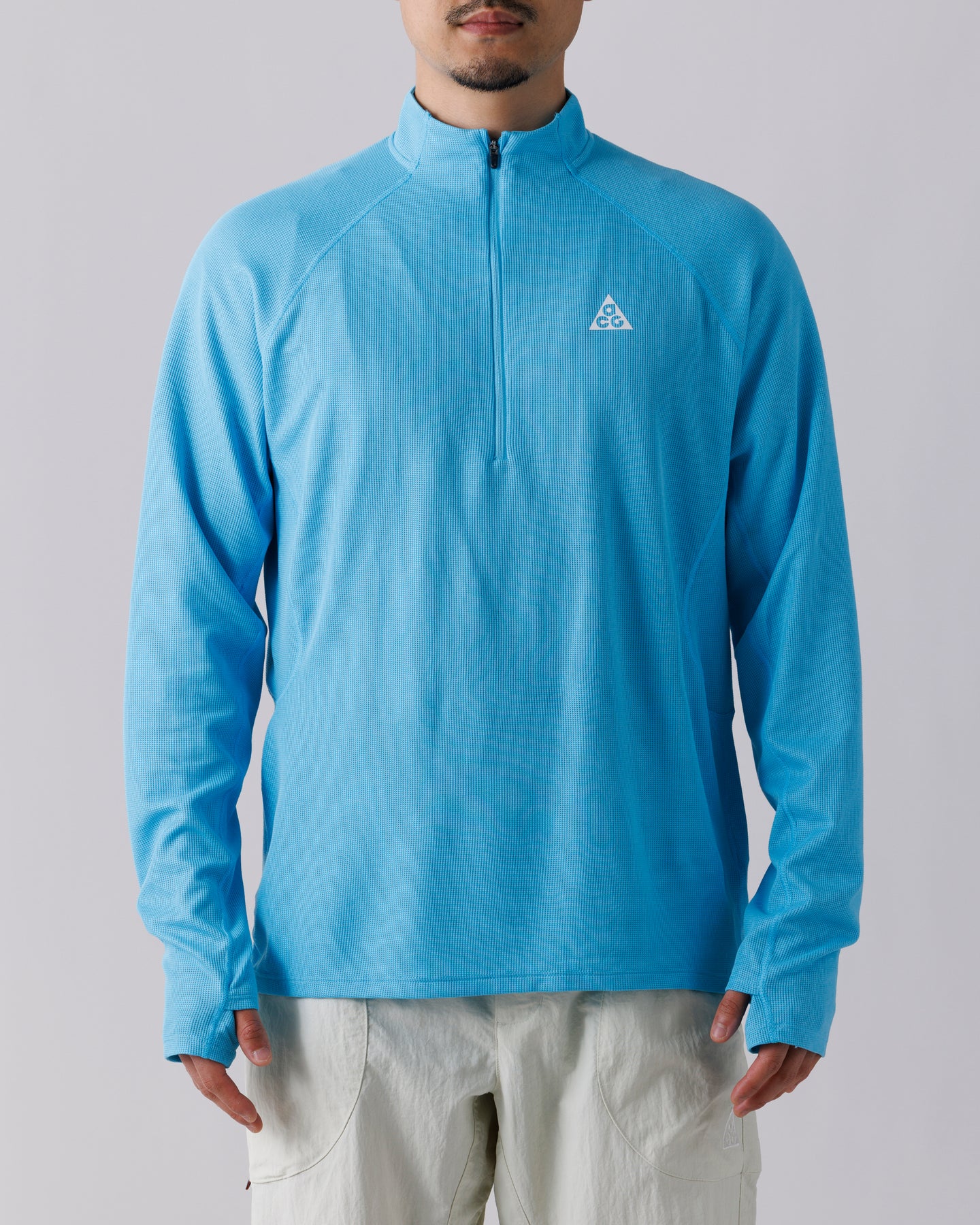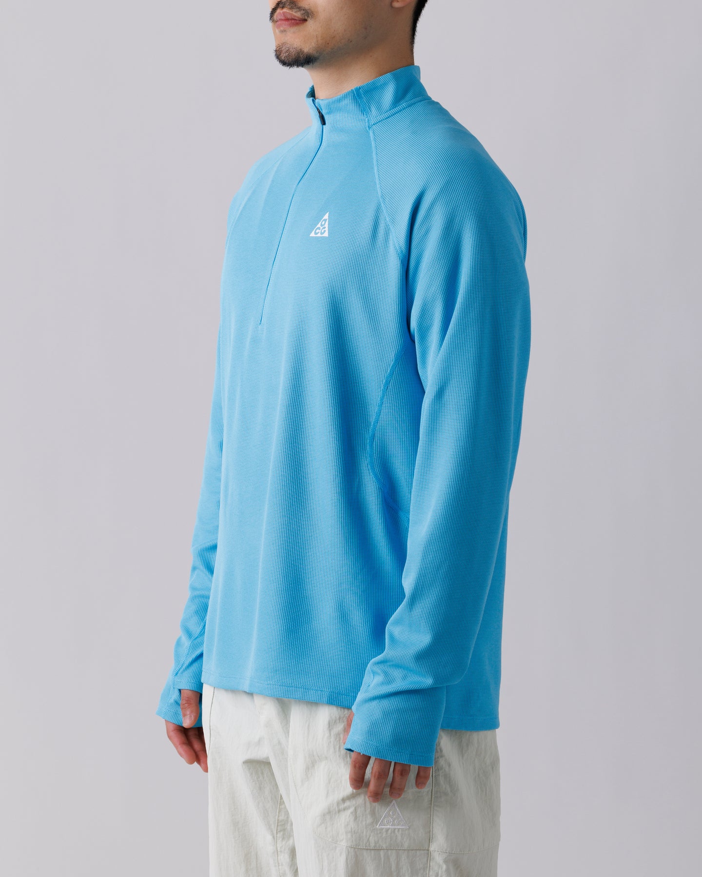 柔らかく伸縮性のあるポリウール混紡のワッフルニット素材を採用。表面に奥行きのある凹凸を持たせることで、見た目にも機能的にも軽快な印象に仕上げられています。ハーフジップ仕様により通気の調整が可能で、袖口のサムホールがレイヤリング時のずれを抑えます。