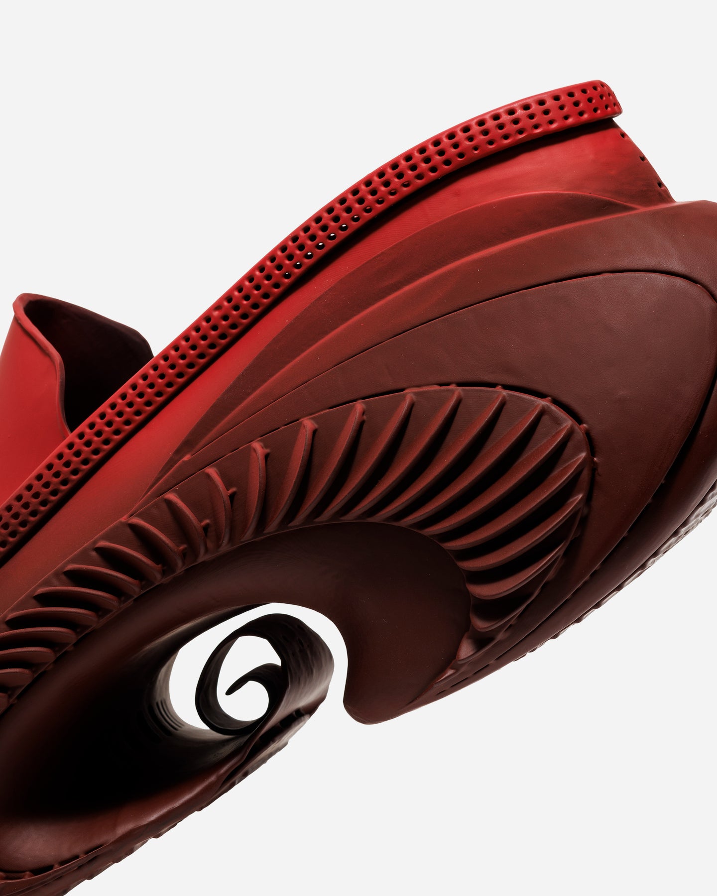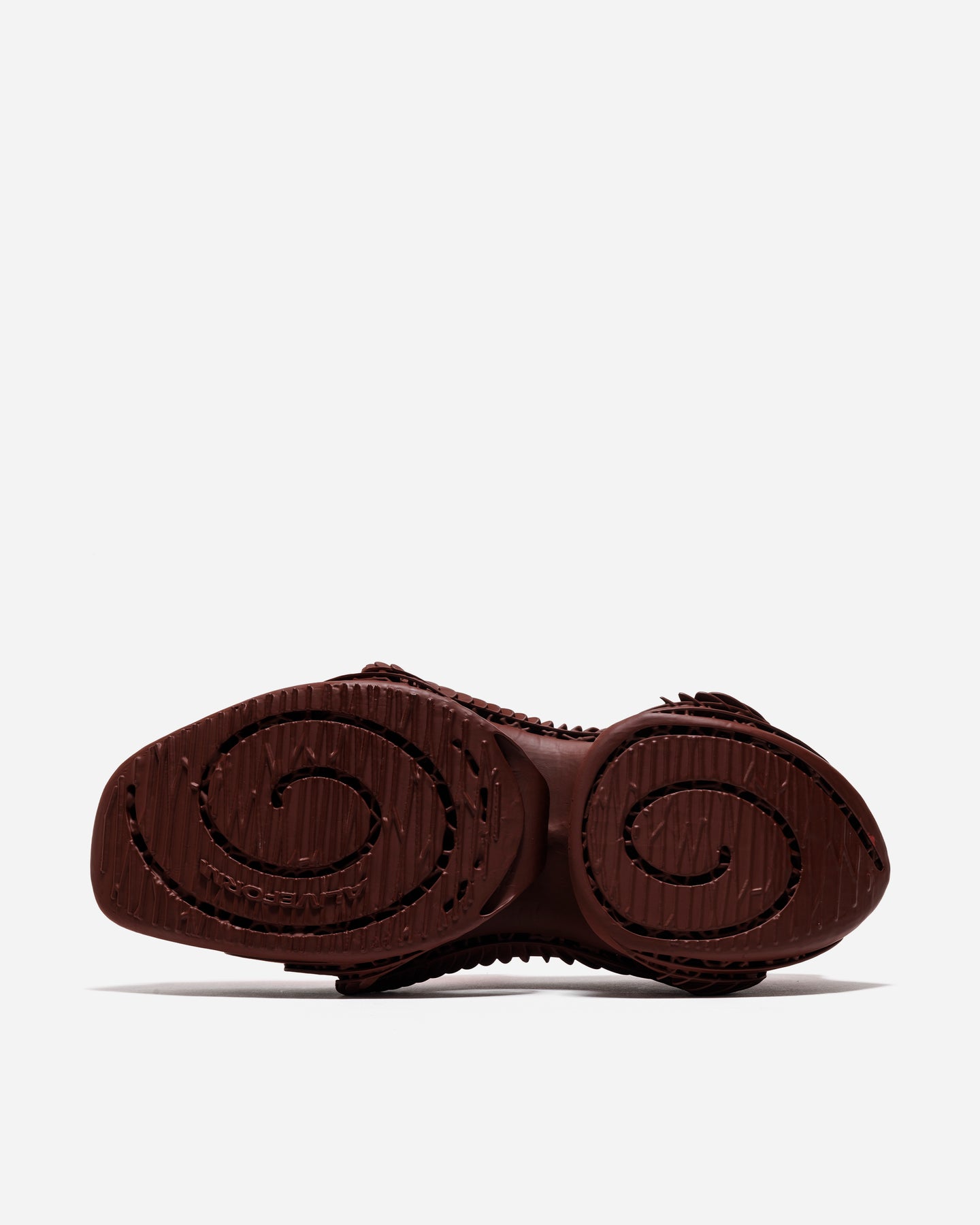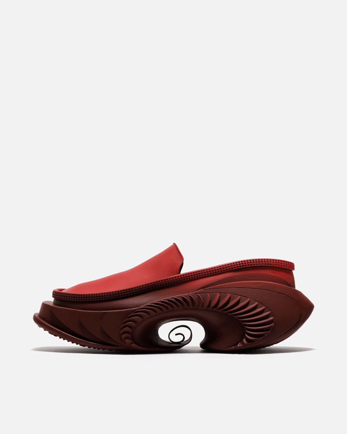 独立したスパイラル構造が際立ち、フォルムの奥行きが明確に表現される。スタイリングの中で主役として機能する一足です。