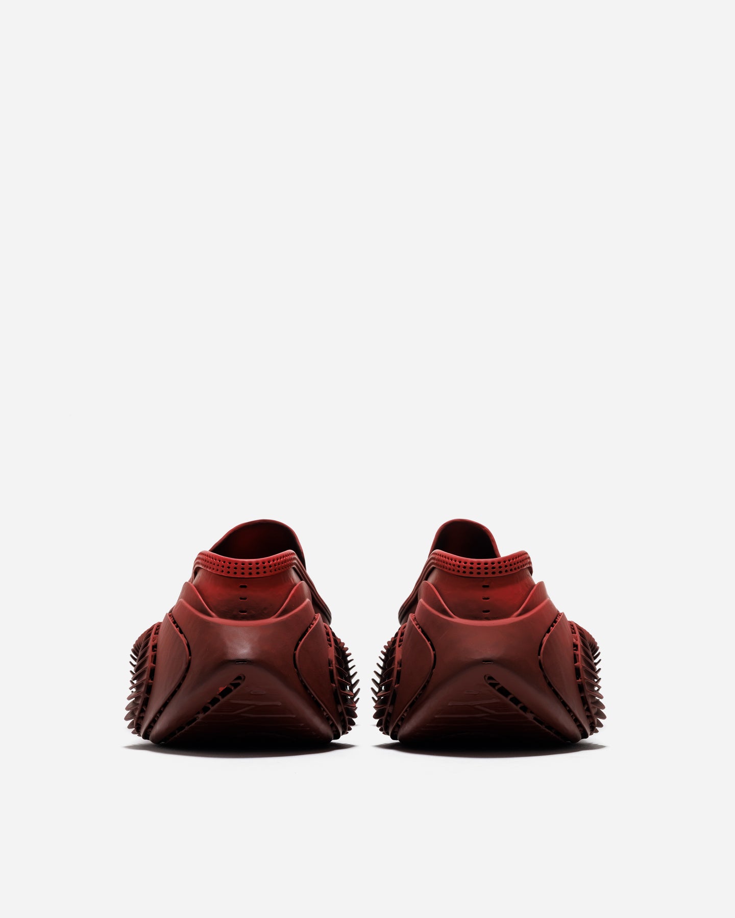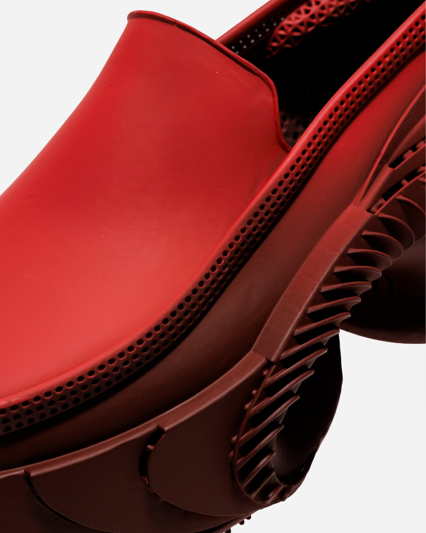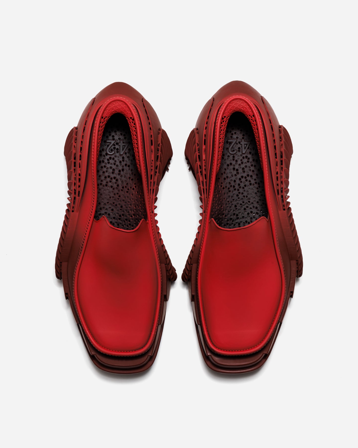 ブライトレッドとダークレッドのレイヤーが、造形の立体感を強調。強い配色でありながら、構造と連動することで視覚的なまとまりを生みます。