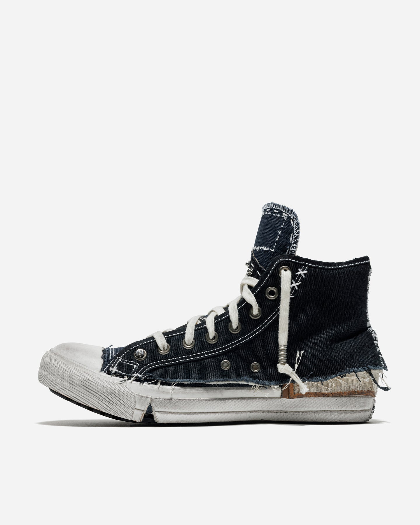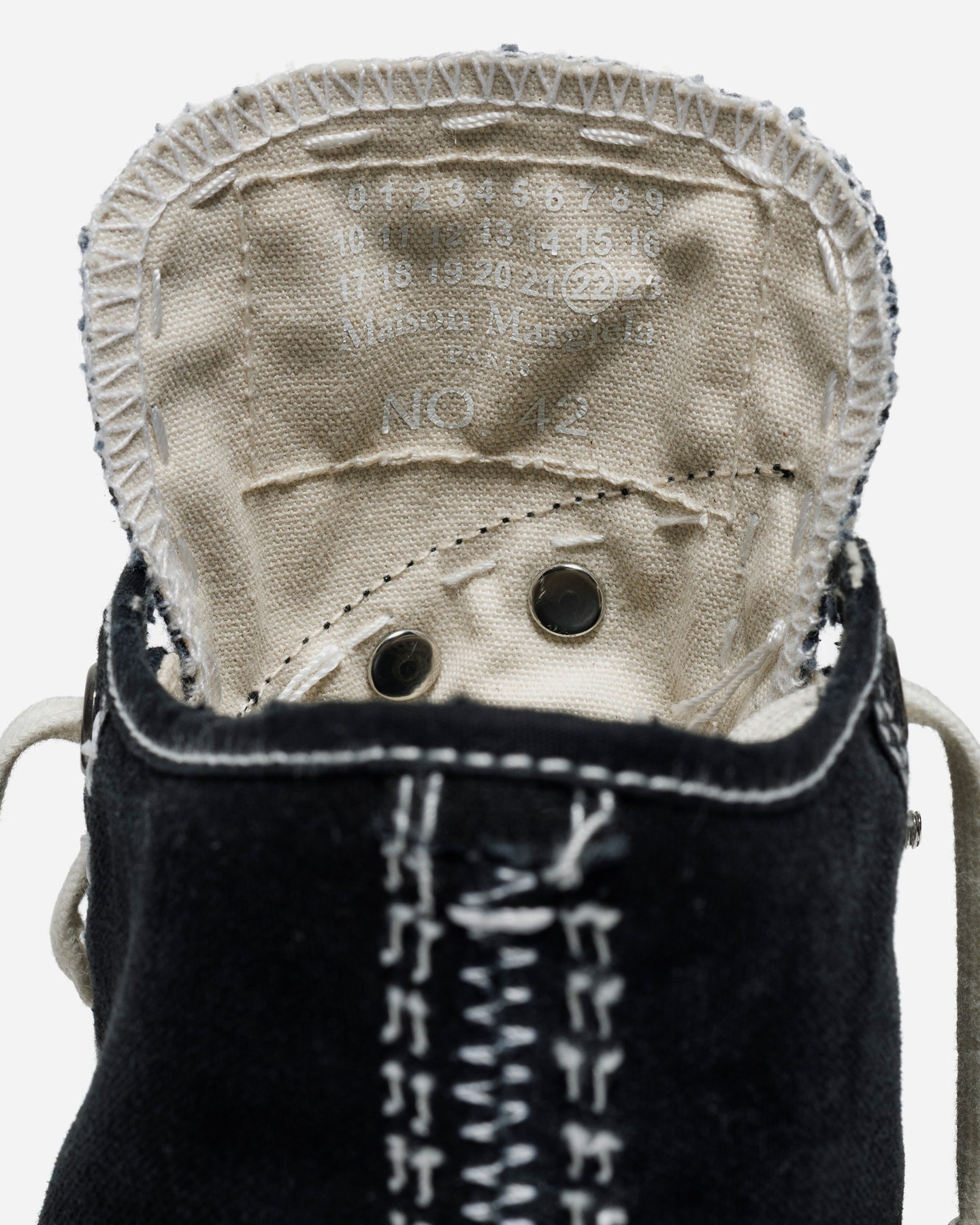 アッパーとライニングにはコットンキャンバスを使用し、素朴なテクスチャの中に内装のヤギ革がラグジュアリーなコントラストを添えます。タンには象徴的なナンバリングラベルを配置し、ブランドのヘリテージを静かに主張。クラシックなハイトップのフォルムを軸にしながら、未完成性と時間性を“完成形の美”へと昇華させた一足です。