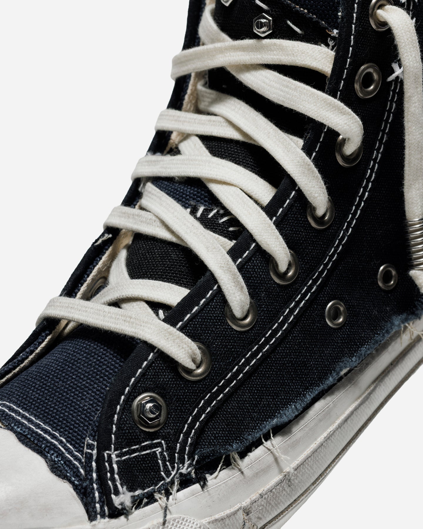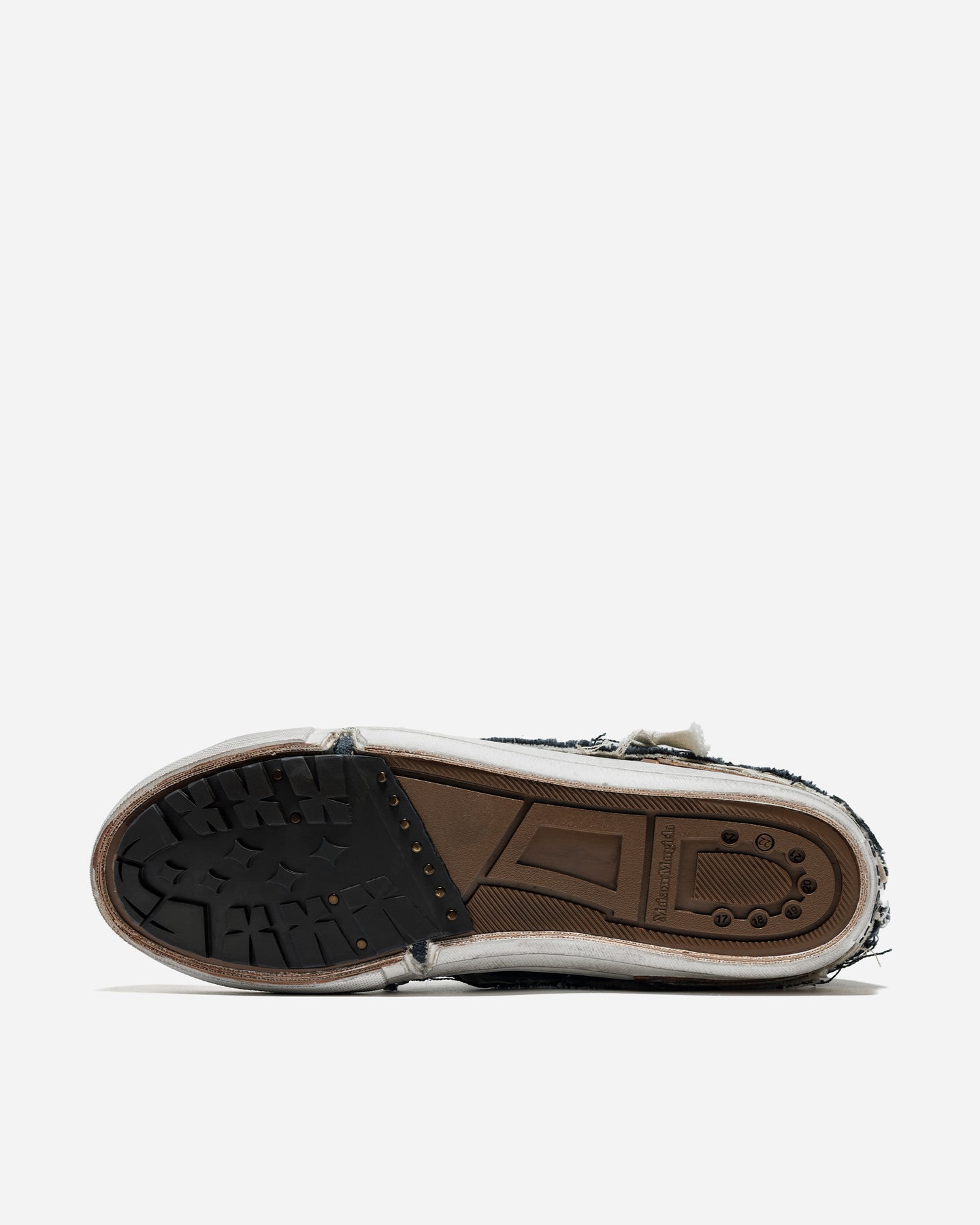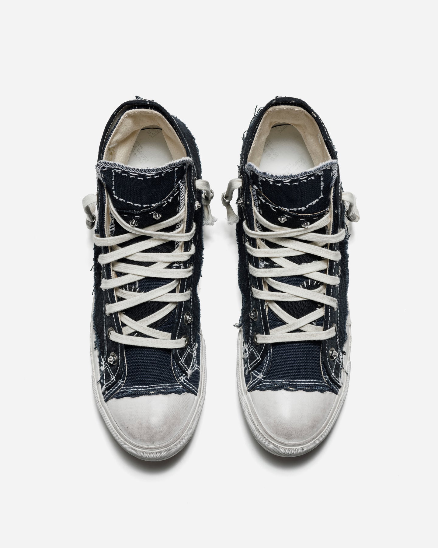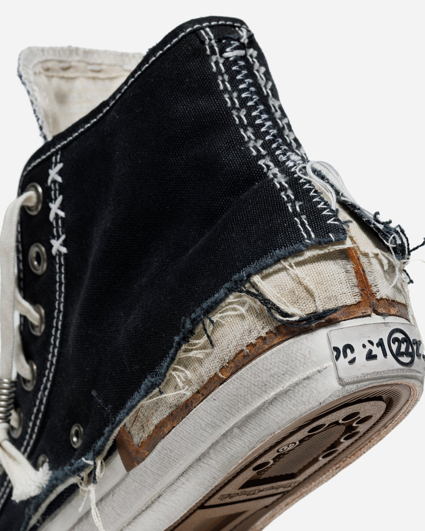 Maison Margiela が提示する「LOVE TO DEATH」は、ただ“古びた加工”ではなく、身に纏い続けることで宿る“愛着の痕跡”そのものを美として捉えるコレクション。レイヤードされたキャンバスを切りっぱなしで仕上げ、縫い目をあえて露出させた構造は、履き継がれてきた時間の積層を表現しています。ダメージ加工の施されたソールや、古びたラバートゥキャップも、偶然の摩耗ではなく「愛用の記憶」を造形的に視覚化したディテール。